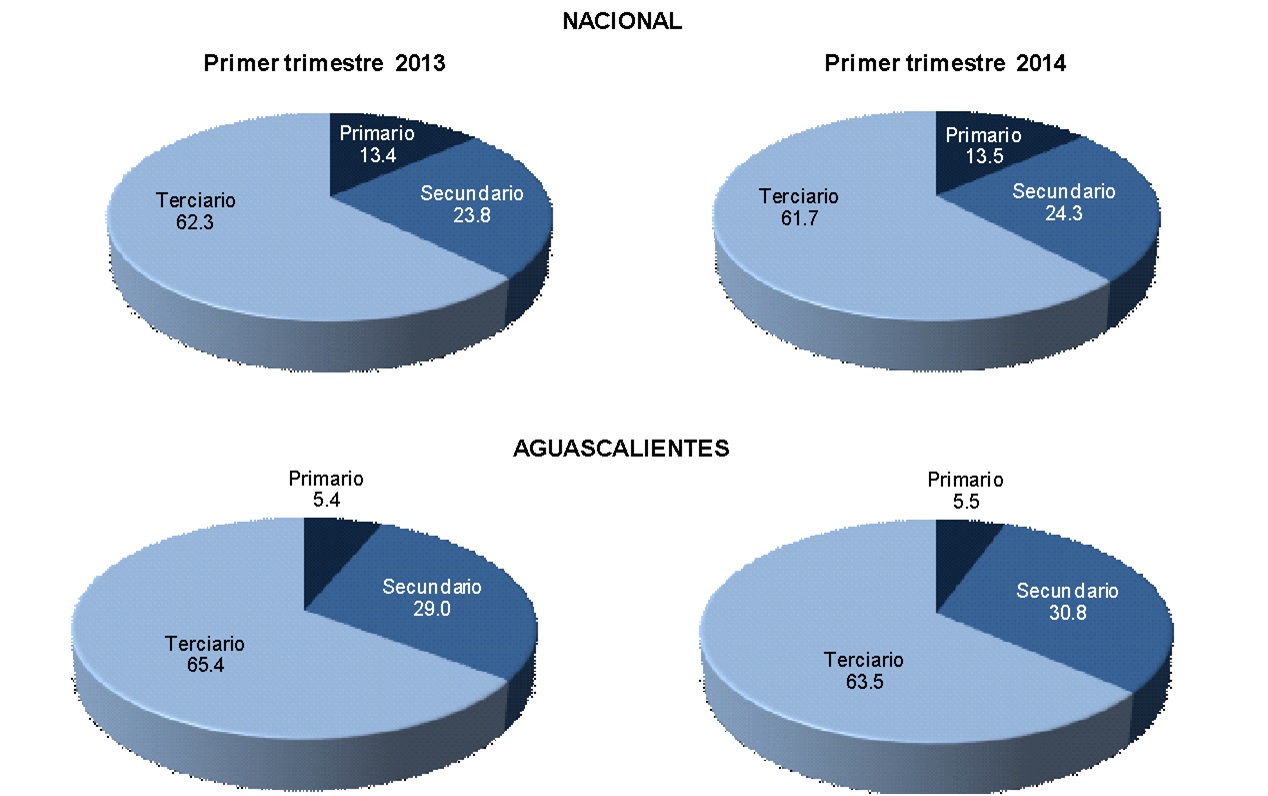 La mayoría de los que se encuentran ocupados lo hacen en el sector servicios (63.5%), por 30.8% que se dedica a trabajar en el sector industrial; es decir que el sector agropecuario sólo concentra el 5.5% de la población ocupada. La población subocupada registró una tasa del 4.3% respecto a la población ocupada en el periodo enero-marzo del 2014.