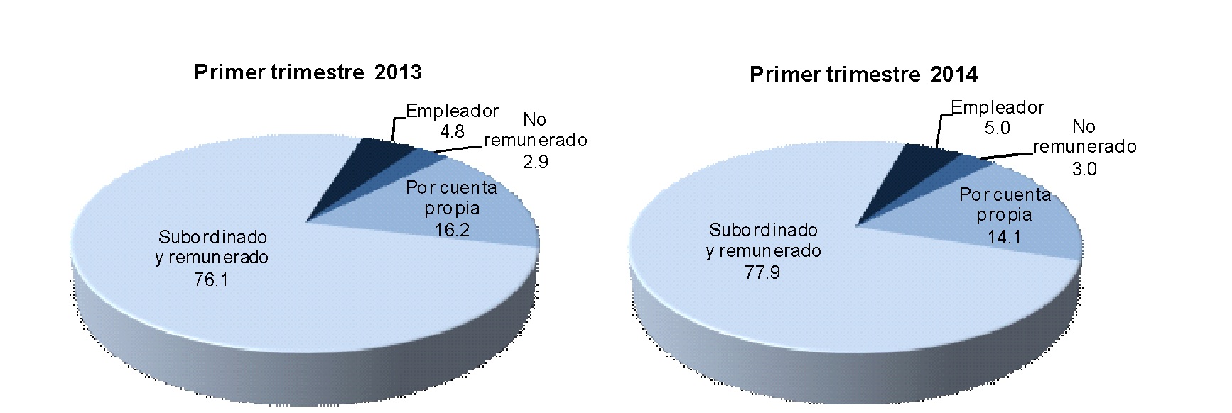 • La población ocupada, en función de la posición que tiene dentro de su trabajo, se aprecia que 5.0% son propietarios de los bienes de producción, con trabajadores a su cargo; mientras que 77.9% son trabajadores subordinados y remunerados; el 14.1% trabajan por su cuenta, sin emplear personal pagado; y 3.0% son trabajadores que no reciben remuneración.