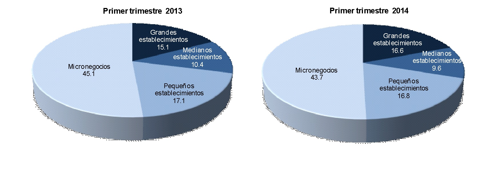 Durante el año que media entre los primeros trimestres de 2013 y 2014, hubo cambios en la composición de los negocios. Por ejemplo: los micronegocios, los medianos y pequeños establecimientos sufrieron decrementos de 1.4, 0.8 y 0.3 puntos porcentuales respectivamente, mientras que los grandes establecimientos, tuvieron un incremento por 1.5 puntos porcentuales. Crecen las grandes industrias pero se estancan las empresas que más generan empleo (ocupan al 70%).