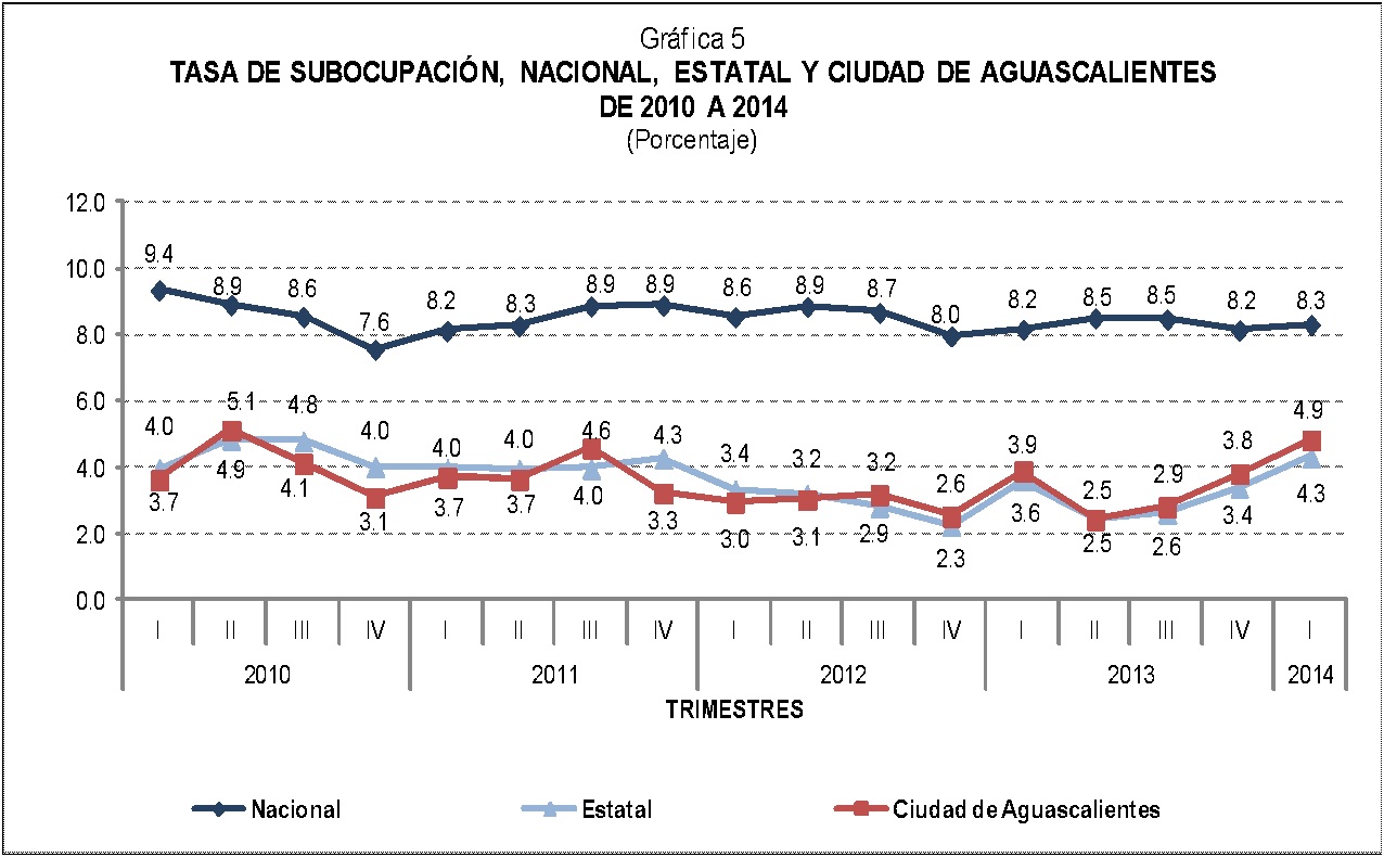 En Aguascalientes, 4.3% de los ocupados declararon tener la necesidad y disponibilidad de ofertar más horas de trabajo de lo que su ocupación actual les permite (población subocupada), mientras a nivel ciudad de Aguascalientes, fue de 4.9%, datos que representan las tasas de subocupación de la población ocupada, valores que resultan superiores en 0.7 y 1.0 puntos porcentuales respectivamente, del registrado durante el mismo periodo del año anterior (3.6 y 3.9 por ciento). A nivel nacional, este indicador es de 8.3% para el primer trimestre de 2014, dato superior en 4.0 puntos porcentuales al registrado para la entidad y 3.4 para la ciudad capital.