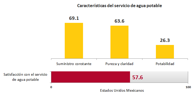 Sobre Agua Potable, se estima que de las 44 millones 24 mil 854 personas de 18 años y más en poblaciones urbanas de más de 100 mil habitantes, en relación con el servicio de agua potable, el 69.1% considera que el suministro de agua es constante. En contraste, el 26.3% considera que el agua es potable. Y se estima que el 26.3% de la población de 18 años y más, considera que el agua en su ciudad es potable (es bebible sin temor a enfermarse).
