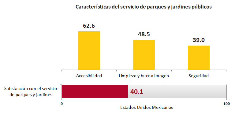 Mientras que con relación a Parques y Jardines Públicos, se considera que el 62.6% de la población de 18 años y más considera que los parques y jardines públicos de su ciudad son accesibles en horario y cercanía. En contraste el 39% considera que son seguros.