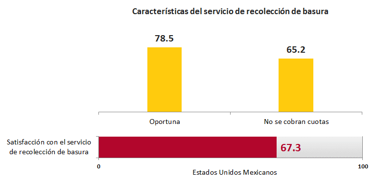En Recolección de Basura, a partir de la ENCIG se estima que el 78.5% de la población de 18 años y más considera que el servicio de recolección de basura en su ciudad es oportuno, mientras que el 65.2% considera que el servicio se realiza sin necesidad de dar cuotas o propinas a los empleados de limpia.
