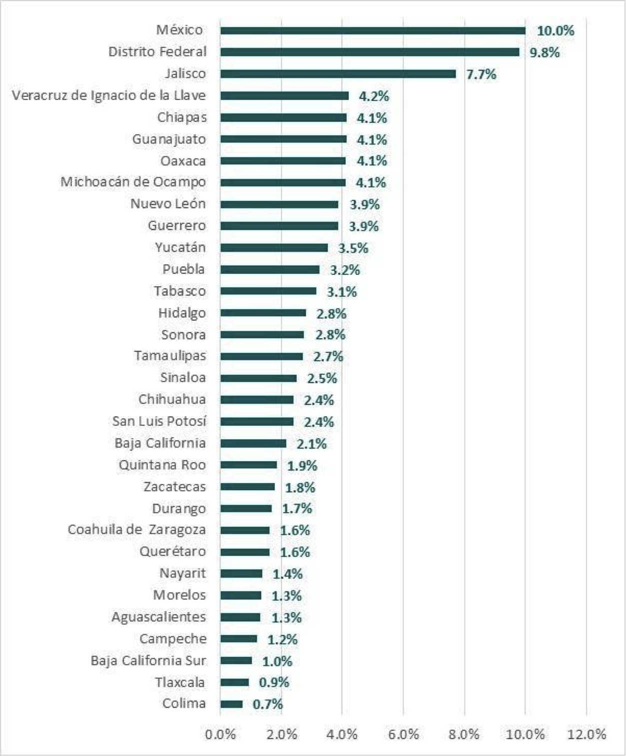 Distribución porcentual del total de personal empleado en las Administraciones Públicas Municipales y Delegacionales por entidad federativa