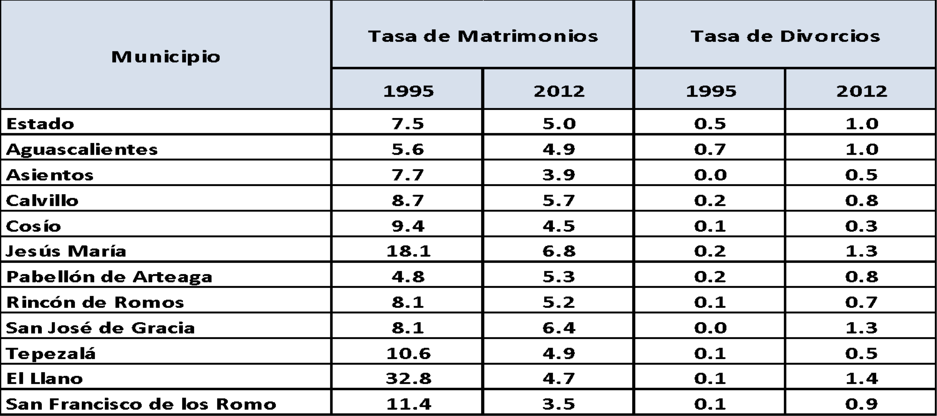En Aguascalientes la nupcialidad es un aspecto demográfico que influye directamente en el comportamiento de la fecundidad, en 1995 la entidad presentaba una tasa en matrimonios de 7.5 por cada mil habitantes, en 2012 se presenta una disminución en la tasa a 5.0 matrimonios; a nivel  municipal las tasas más altas en 2012, se registran en San José de Gracia (6.4%) y Jesús María (6.8%); mientras que San Francisco de los Romo (3.5%) y Cosío (4.5%) presentan las más bajas. En lo referente a los divorcios, en 1995 la entidad presentaba una tasa del 0.5 por cada mil habitantes y para el 2012 sube a 1.0 puntos.