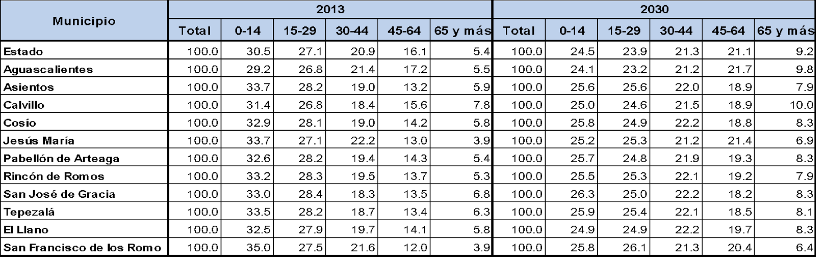 Datos de Aguascalientes indican que en 2013, la proporción de población joven de 0-29 años representa el 57.6%, mientras que este mismo rango para el 2030, representará únicamente el 48.4%, y el grupo de 30 a 65 y más años, es del 42.4 en 2013 y 51.6% en 2030.