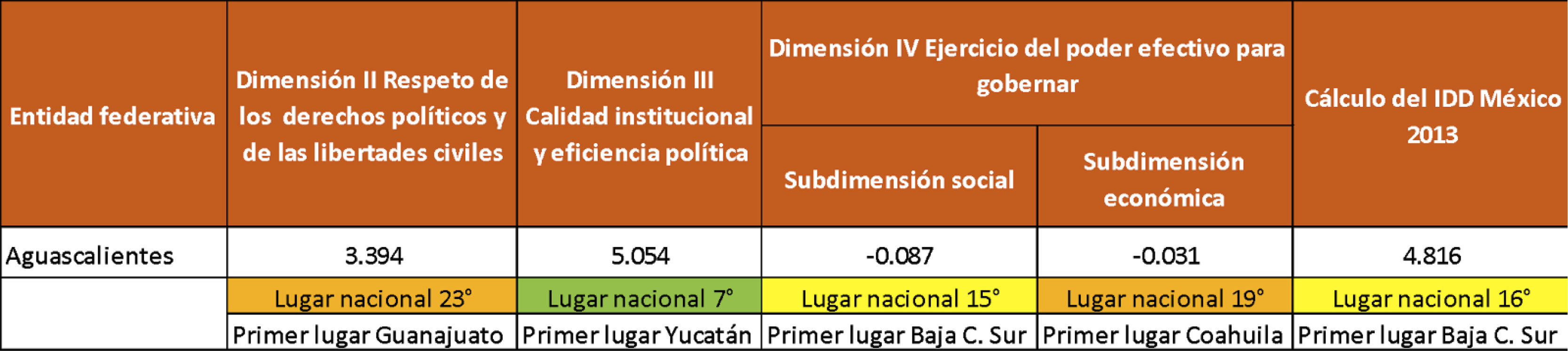 Aguascalientes desciende del 6º al 17º lugar, con una caída en su puntaje de más de 2,000 puntos. Ocupa el 23º lugar en Democracia de los Ciudadanos, desciende en Democracia de las Instituciones una posición para ubicarse en el 7º lugar. Logra una mejora en la Subdimensión Social y en la Económica, ocupando los lugares 17º y 19º respectivamente.