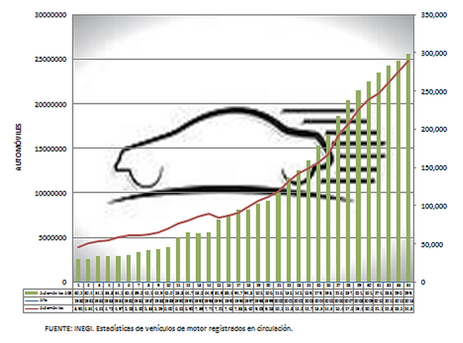 La mayoría de los vehículos registrados corresponden a automóviles particulares, mismos que pasaron de 3 millones 950 mil 42 a 24 millones 819 mil 524 en el país (1980 a 2013); y en Aguascalientes se incrementaron, en el mismo lapso, de 30 mil 230 a 299 mil 134; multiplicándose los automóviles prácticamente por diez, con una tasa tres veces más rápida que la de la población.