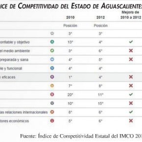Aún con todas estas materias pendientes marcadas en rojo (17/89) en lo general Aguascalientes se preserva entre las tres mejores entidades en competitividad del país (después del Distrito Federal y Baja California Sur) superando a entidades muy completas como Nuevo León y Querétaro. Hemos relacionado aquí las materias pendientes para el IMCO, como un buen propósito de año nuevo: el de mejorar nuestras fortalezas, atendiendo de manera más solvente nuestras debilidades, aprovechando todas las oportunidades y conjurando las amenazas.