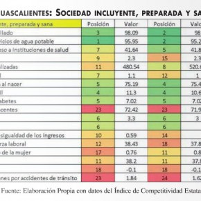 En el renglón de Sociedad incluyente, preparada y sana resalta la entidad hidrocálida por los embarazos en adolescentes. Es decir, por el número de hijos que tienen las mujeres adolescentes. La maternidad temprana puede reducir la probabilidad de educación tanto de la mujer como de sus hijos. Destaca también, como materia pendiente, las muertes de peatones en accidentes de tránsito terrestre en zonas urbanas y suburbanas, que es de las más altas y se mide en muertes por cada 100 mil personas. En disponibilidad de médicos relativo a la población, Aguascalientes pasó de los 10 primeros lugares a ubicarse a media tabla.