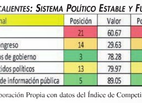 En cuanto al Sistema Político Estable y Funcional, la pelota se encuentra en la cancha ciudadana, dado que la población que participó en las elecciones presidenciales de 2012 (votos como porcentaje del padrón electoral) fue reducido, y la entidad se ubicó entre los lugares del último tercio de la tabla, que posiciona a los estados del país. Por otro lado, y aunque el lugar no es tan bajo la percepción de corrupción por cada cien es alta.