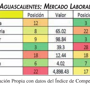 Para el mercado laboral aguascalentense, el IMCO especifica que la eficiencia terminal local en secundaria ha mejorado notablemente, pero se redujo la correspondiente a preparatoria (bajó 14 lugares). De hecho hace patente también una baja sensible en el rendimiento académico, renglón en el que se perdieron 25 lugares en sólo dos años. El rendimiento académico se mide en alumnos de 3°, 4°, 5° y 6° grado de primaria con niveles de logro “Bueno” y “Excelente” en la prueba Enlace de matemáticas.