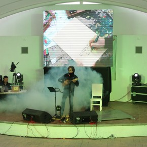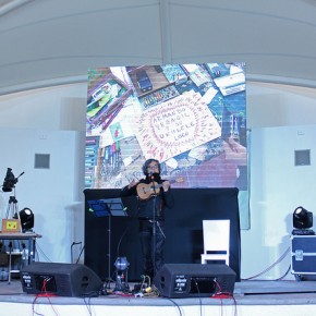 Apoyado de una pantalla, el músico, escritor y cineasta, Armando Vega-Gil, empezó su espectáculo que conjunta música, narración, dibujo y mucho baile; junto a él se encontraba Pablo Zeta mostrando su habilidad con los plumones y crayones, ilustrando todo lo que su compañero y los niños cantaban e improvisaban.