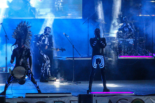 Con un vestuario muy particular, los Blasted Mechanism de Portugal pusieron a bailar a todo aquel feriante cercano al Foro del Lago con estilo mix de electro, reggae, ska, rock y batucada; vistiendo trajes negros completos con grecas blancas fluorescentes, enmascarados en su totalidad y un penacho indio, los seis integrantes demostraron que un escenario alterno al principal puede tener un aforo plural en edades en su máxima capacidad.