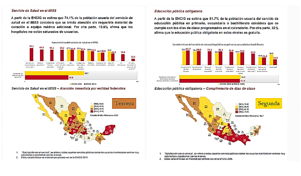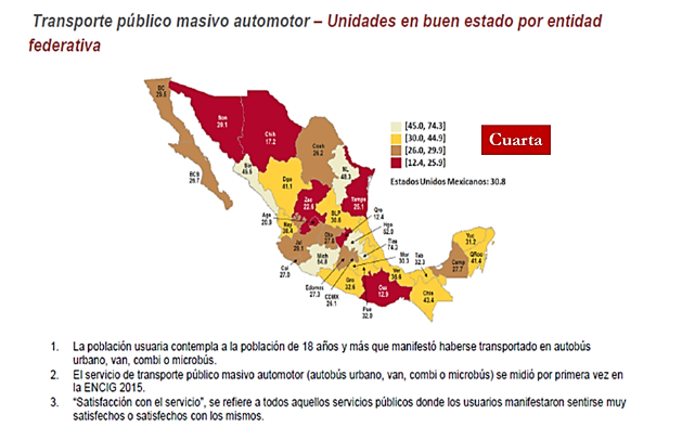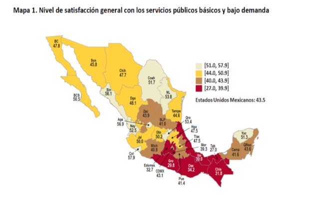 Particularmente, los servicios públicos básicos: calles y avenidas, policía y alumbrado público, obtuvieron un nivel de satisfacción de 20.7%, 25.3% y 33%, respectivamente. En cuanto a los servicios públicos bajo demanda, 61% de la población manifestó estar satisfecha con el servicio de educación pública obligatoria durante 2015, mientras que para el servicio de salud en el Instituto Mexicano del Seguro Social (IMSS) la satisfacción fue de 38.8% y, respecto al transporte público masivo automotor, fue de 28.9%.