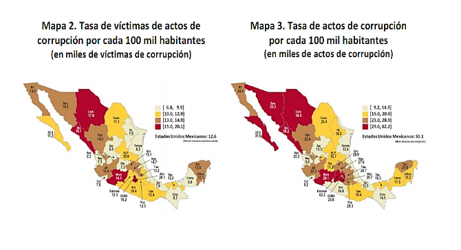Además, se estima que entre nosotros, la tasa de prevalencia de corrupción es de ocho mil 300 víctimas por cada 100 mil habitantes; mientras que la incidencia es de 20 mil 200 actos de corrupción por cada 100 mil habitantes. Estas cifras expresan, tanto la relación de personas afectadas, como las experiencias de corrupción registradas en trámites, pagos y solicitudes de servicios públicos, así como otro tipo de contactos con servidores públicos en áreas urbanas de Aguascalientes.