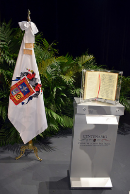 Con la representación del presidente de la República, Enrique Peña Nieto, el secretario de Economía del Gobierno Federal, Ildefonso Guajardo Villarreal, entregó al gobernador Martín Orozco Sandoval, un Facsimilar de la Constitución Política de los Estados Unidos Mexicanos de 1917, como símbolo de la unidad que debe prevalecer entre los mexicanos.