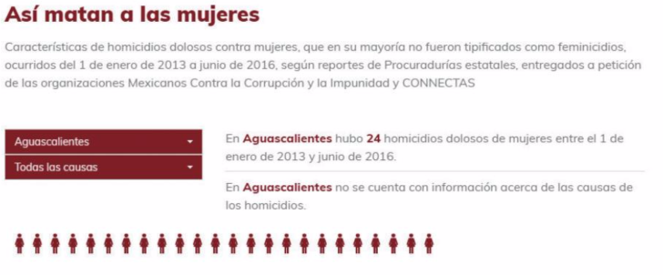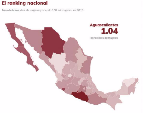 Para realizar el análisis de la violencia de género en México, Valeria Durán solicitó por medio de Transparencia a cada una de las Procuradurías y Fiscalías de los 32 estados el número de homicidios dolosos violentos contra mujeres, pidió especificar la causa de la muerte, así como si los cuerpos tenían rastros de violencia sexual, mutilaciones y quemaduras. Las autoridades estatales reportaron que de enero de 2012 a junio de 2016 habían sido asesinadas en forma violenta en todo el país nueve mil 581 mujeres, pero sólo mil 887 de esos crímenes fueron tipificados como feminicidios: el 19 por ciento. El informe dice: “Con base en estos informes, al menos siete mil 694 mujeres que fueron asesinadas a balazos, descuartizadas, violadas, asfixiadas o golpeadas hasta morir no fueron reconocidas como víctimas de feminicidios”. Revela que la tasa de homicidios de mujeres por cada cien mil mujeres, en 2015, en el ámbito nacional, es de 3.87 homicidios de mujeres. En Aguascalientes es de 1.4. Las Procuradurías y Fiscalías en México sólo han juzgado como feminicidios a 1 de cada 5 asesinatos de mujeres.