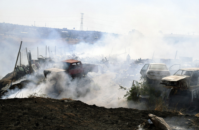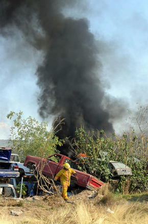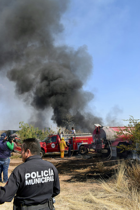En un domingo que se caracterizó por registrar múltiples incendios en diversos puntos de la ciudad, uno en particular requirió la puesta en marcha de un importante operativo de los elementos de Seguridad Pública involucrando a la Policía vial, Bomberos y Protección Civil. La quema de un pastizal seco a espaldas de un yonke sobre la carretera Norias de Ojocaliente se extendió debido a las corrientes de aire, el fuego alcanzó a los carros desmantelados y terminó por encender los químicos de una fábrica contigua. La inmensa columna de humo negro que se levantó durante más de una hora se desvaneció conforme las unidades de bomberos vaciaron sus reservas de agua sobre las llamas y los autos deshechos. Se registraron cuantiosas pérdidas materiales.
