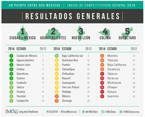 De acuerdo con el Índice de Competitividad Estatal 2016, los cinco estados más competitivos del país son la Ciudad de México, Aguascalientes, Nuevo León, Colima y Querétaro. Todos se encuentran dentro de los primeros seis lugares en el subíndice Sociedad incluyente, preparada y sana debido a su capacidad para proveer a la mayoría de su población servicios básicos de vivienda, educación y salud. Sin embargo, el mayor reto de estos estados es el fortalecimiento de su Estado de Derecho, ya que solo Aguascalientes logró mantener bajos niveles de homicidios y secuestros y, por consiguiente, una mayor percepción de seguridad.