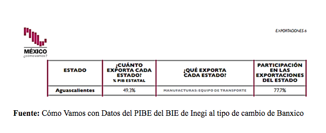 Aguascalientes exporta la mitad de lo que produce y el 77% de eso corresponde a autopartes, autos y equipo de transporte. Se pagan insumos y se exportan manufacturas en dólares, pero a la mano de obra la conservan en pesos. De ubicarse en 20 dólares el salario promedio de cotización en el IMSS para el 2013, en el 2017 este mismo indicador bajó a 13 dólares; el equivalente a una pérdida de 7 dólares diarios por trabajador.