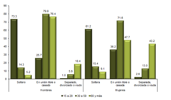 La mayor parte de la población de 15 y más años se encuentra unida. Así lo indica la Encuesta Nacional de Ocupación y Empleo (ENOE) en el tercer trimestre del 2016: casi tres quintas partes (58.1%) se encuentra en esta situación conyugal, mientras que 31.4% está soltera y 10.5% se encuentra separada, divorciada o viuda. Esta estructura cambia radicalmente conforme la edad de la población; por ejemplo, gran parte de los hombres jóvenes (15 a 29 años) son solteros (73.3%), en tanto que en edades más avanzadas el predominio de la población unida es mayor: en los hombres de 30 a 59 años y en los de 60 y más añosdicha proporción llega a ser del 79.8% y 76.4%, respectivamente.