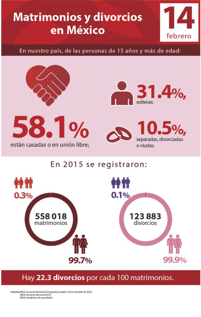 En los últimos años el número de divorcios ha aumentado en relación con los matrimonios y ello se debe a que un mayor número de personas decide vivir en unión libre, dando paso a menor número de uniones legales. Entre los años 2000 y 2015 el monto de divorcios aumentó 136.4%, mientras que el monto de matrimonios se redujo en 21.4 por ciento.