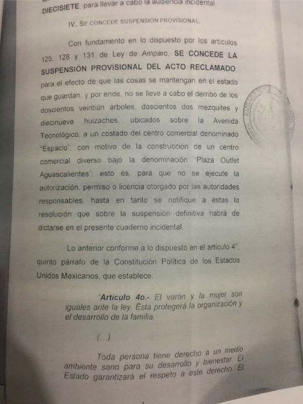 El miércoles 15 de febrero, interpuso ante el Poder Judicial de la Federación el recurso contra la tala de 221 árboles -202 mezquites y 19 huizaches- en el Ejido Ojocaliente que se prevé llevar a cabo para edificar el centro comercial, en una superficie de 2.4 hectáreas.