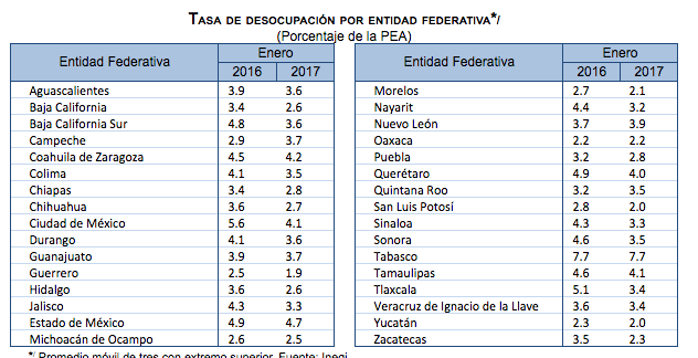 En Aguascalientes, durante enero, la tasa de tasa de desocupación mostró un descenso en comparación con el mismo mes del 2016 al pasar de 3.9 a 3.6, cifra similar a la de la media nacional y que ubica a la entidad entre los estados con desocupación a la baja.