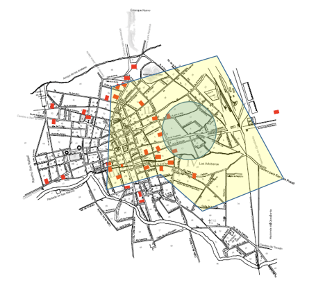 De esta forma, y de acuerdo con el mapa, podemos definir que aparecen cuatro grupos más o menos definidos de éstas habitaciones. Uno, en las últimas calles de Nieto, en el extremo poniente de la urbe. Otro en el oriente, donde no mucho antes sólo había huertas. El más numeroso, en el extremo norte, por las últimas calles de Tacuba, teniendo entrada por ésta o por las que de ella partían perpendicularmente, como las de la Mora, Terán y La Morita. Finalmente, un cuarto grupo se forma alrededor y hacia el norte del barrio de Guadalupe, la zona donde se empezaban a construir las colonias México y del Carmen y que, si no en ese momento, con el paso de los años se convertiría en el sitio por excelencia de vecindades en la ciudad.
