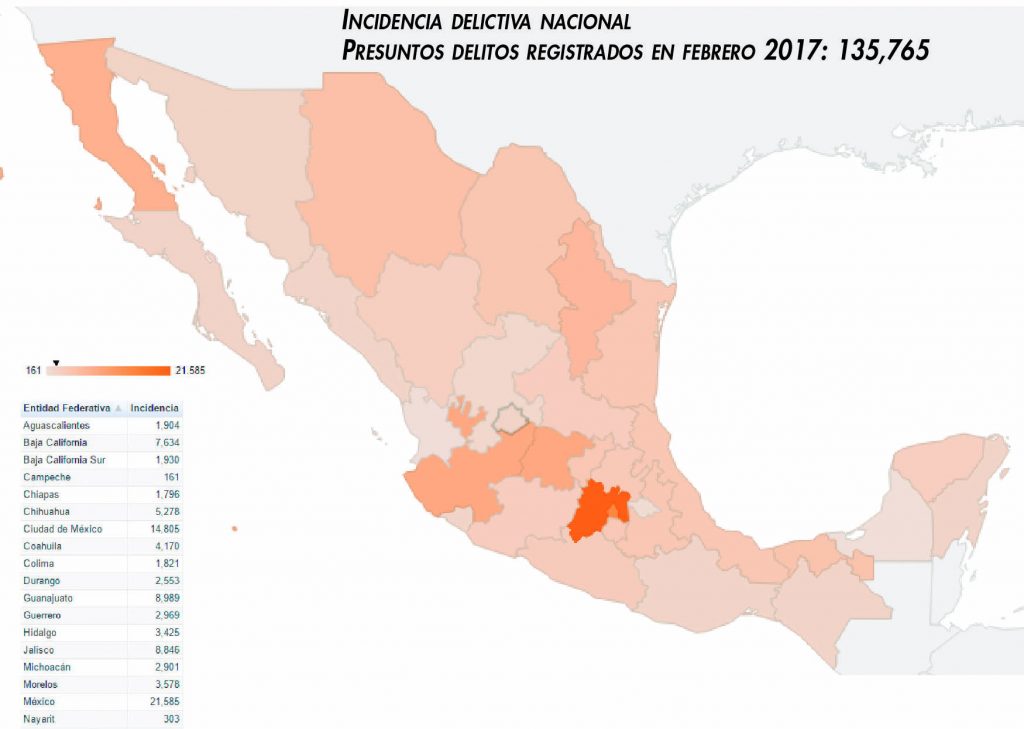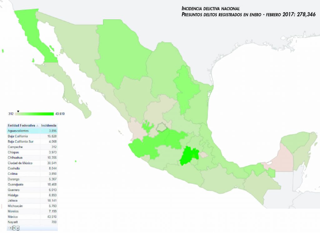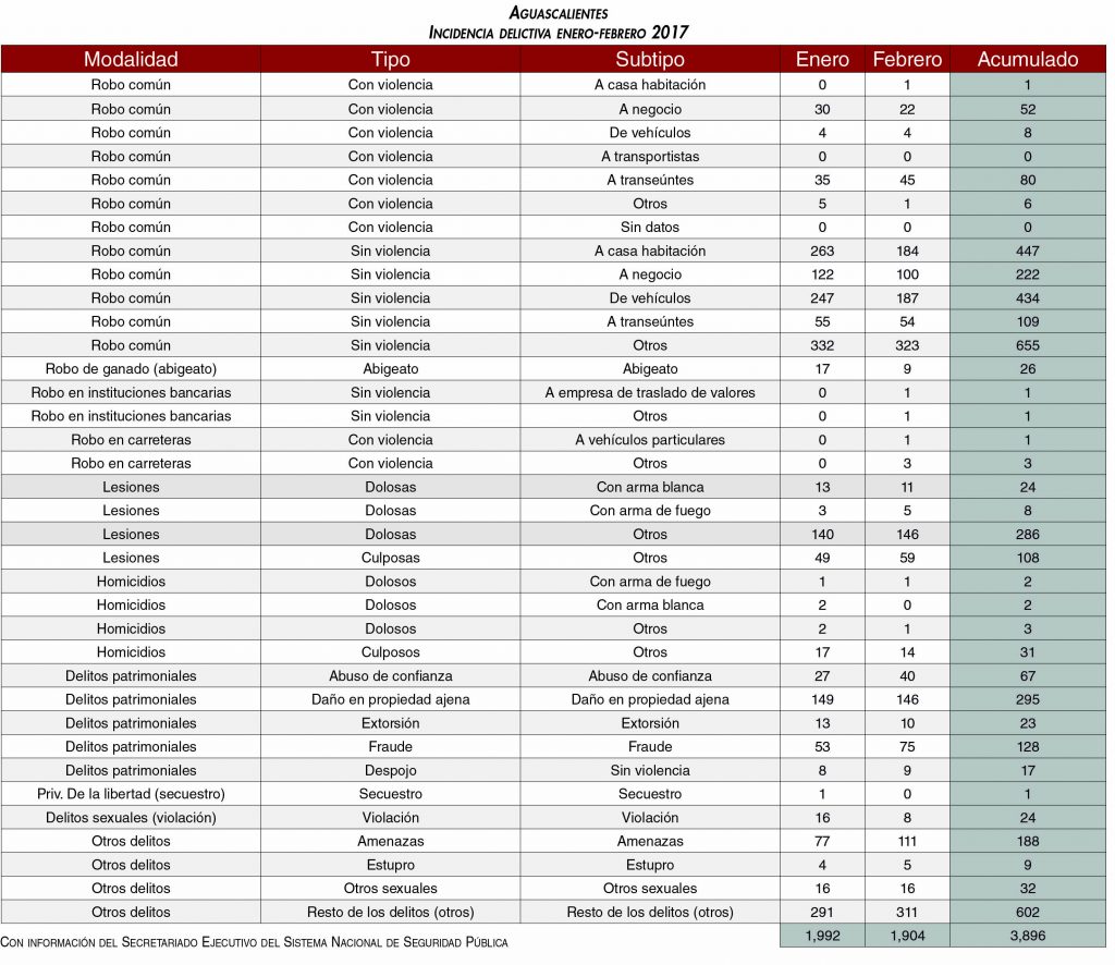 De acuerdo con las cifras del Secretariado en febrero, los presuntos delitos registrados en todo el país durante el primer bimestre de 2017 fue de 278,346; y en febrero se registraron 135,766. El Estado de México fue la entidad con más delitos del fuero común con un total de 21 mil 585, seguido de la Ciudad de México con 14 mil 805, Guanajuato con ocho mil 989, Jalisco con ocho mil 846 y Nuevo León seis mil 346 ilícitos de ese tipo. En Aguascalientes, los presuntos delitos registrados en febrero 2017 sumaron mil 904, mientras que el acumulado en el periodo enero – febrero fue de tres mil 896.