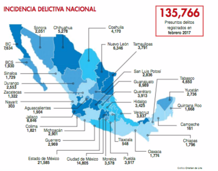 En los dos primeros meses de 2017 ocurrieron en el país tres mil 779 homicidios dolosos, de los cuales dos mil 533 se cometieron con arma de fuego. En el país, la tasa de homicidios por cada cien mil habitantes fue de 3.06 casos, y de las 32 entidades del país, once sobrepasaron la media nacional en 2016, que fue de 17. Del total de homicidios dolosos, el 67 por ciento se ejecutó con arma de fuego, siete de cada diez homicidios se cometieron con arma de fuego, uno con arma blanca y los dos restantes con otro método.