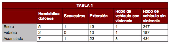 - En la entidad, en el primer bimestre, se denunciaron 7 homicidios dolosos, un secuestro, 23 víctimas de extorsión y 442 robos de vehículos