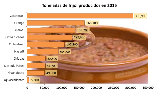 En el año 2105, la producción nacional de frijol ascendió a 1.1 millones de toneladas. Zacatecas produjo más del 27% con 306 mil 900 toneladas, Chihuahua 107 mil 800, Durango 166 mil 100, Sinaloa 139 mil 700, Nayarit 90 mil, Chiapas 52 mil 800, San Luis Potosí 51 mil 700, Guanajuato 49 mil 800, y en Aguascalientes 5 mil 300 toneladas. El resto de los estados 129 mil 900.