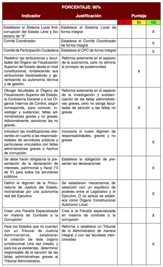 El estado obtuvo una calificación de 90 por ciento, según el análisis basado en diez criterios: creación de un Sistema Estatal Anticorrupción, Comité Coordinador, Comité de Participación Ciudadana, fiscalía especializada en combate a la corrupción, tribunal de justicia administrativa, incorporación de un nuevo régimen de responsabilidades de servidores públicos, declaración 3de3 obligatoria y autonomía en los tres poderes.