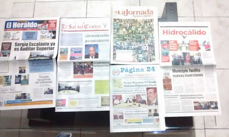 Para las noticias de ocho columnas que protagonizó el Gobierno del Estado, los medios publicaron así: El Heraldo tres; Hidrocálido una; La Jornada ninguna; Página 24 ofreció tres; mientras El Sol del Centro publicó nueve.