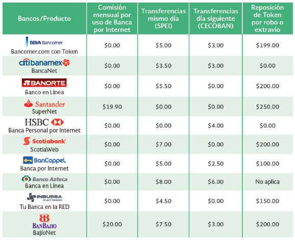 Los costos de las comisiones por el uso de la banca en línea, transferencias y reposición de Token, pueden variar dependiendo de la institución financiera, por ello, a continuación, se muestra el costo de utilizar la banca por internet para personas físicas: