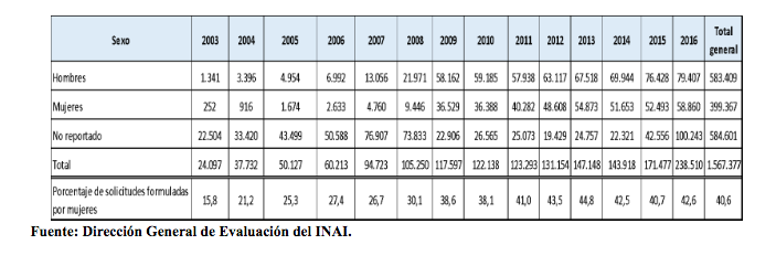 Número de solicitudes de información ingresadas por año según el sexo reportado del solicitante del 12 de junio de 2003 al 31 de diciembre de 2016