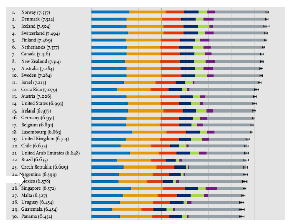 En Latinoamérica, Costa Rica es el país mejor calificado, ocupando en el concierto mundial el lugar número doce, le sigue Chile con el 20 y enseguida Brasil en el 22, Argentina con el 24 y México en el 25; estos últimos con sus mejores calificaciones en rubros como el de solidaridad, la libertad, la generosidad, la honestidad, la salud, la renta, pero ninguno se destaca por tener un buen gobierno.