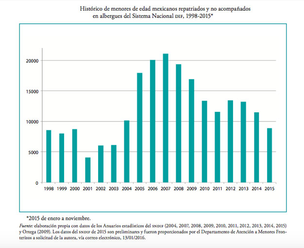 De acuerdo con el documento, en el año 2000 el Sistema Nacional DIF reportó la atención de ocho mil 768 NNA migrantes no acompañados en su red de albergues; la cifra creció a partir de 2004, llegando en 2007 a 21 mil 73 mexicanos menores de edad en calidad de no acompañados.