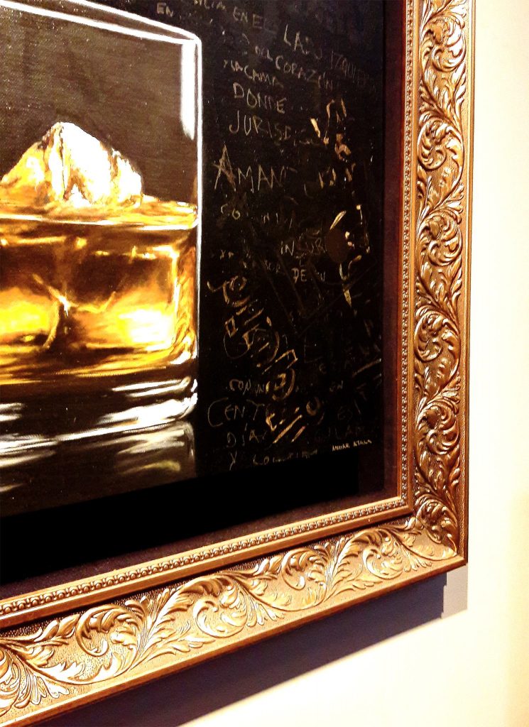 La obra se presenta sobre una marialuisa de tela negra que finaliza en un marco dorado de diseño tradicional, ancho y ostentoso que además de crear la ilusión de que la pintura es de dimensiones mayores a las reales, aporta cierto carácter que bien puede empatarse con el whiskey y sus connotaciones de estatus o bien sugerirnos la importancia que tiene la bebida para el autor al ponerla en una suerte de pedestal a muro. Posiblemente la presentación sólo atiende a cuestiones de armonía cromática y a la idea de presentar la obra lo mejor posible, situación que siempre se agradece pues en ocasiones pareciera que a los artistas se les olvida ese último detalle y a veces ni los cantos de su soporte son capaces de pintar.