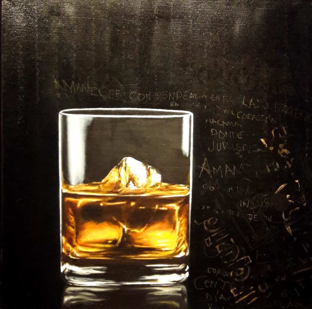 Una vez terminada la descripción formal de la pieza, es tiempo de interpretar: El fondo negro, además de provocar que el espectador se meta a la pintura, nos permite pensar en ideas de oscuridad, elegancia, abismo, noche y le proporciona un carácter de tintes dramáticos a la obra. Si se piensa en los distintos colores de los destilados y sus más comunes formas de servirse, quizás sea fácil deducir que lo que el vaso contiene es un trago de whiskey. El negro contrasta bastante bien con la solución pictórica de la bebida y genera un buen grado de atracción e incluso de incertidumbre pues, si bien se sabe que es una bebida fría, el color y el tratamiento de la pincelada también pudiesen hacernos pensar en una temperatura incongruente con la imagen, en el fuego, ¿acaso el infierno en un whiskey on the rocks?