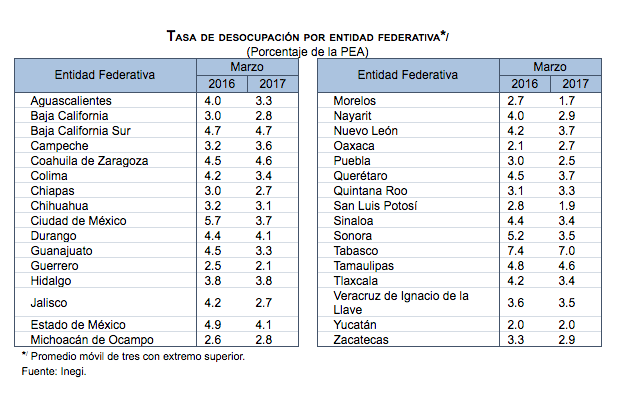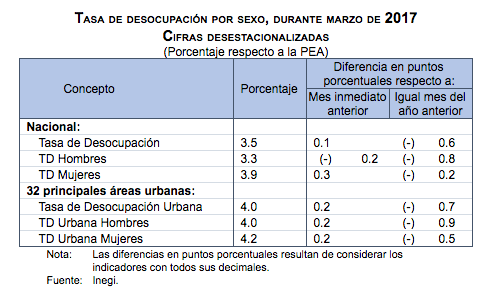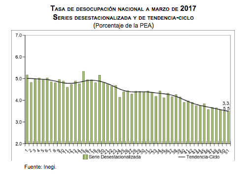 Durante marzo, la tasa de desocupación (TD) fue de 3.5 por ciento de la Población Económicamente Activa (PEA) en el ámbito nacional, tasa similar a la del mes previo, informó el Instituto Nacional de Estadística y Geografía (Inegi) a través de los resultados de la Encuesta Nacional de Ocupación y Empleo (ENOE), la cual indica que para marzo de 2017, en su comparación anual, la TD disminuyó en el tercer mes de este año, frente a igual mes de 2016 (3.5 contra 4.1 por ciento).
