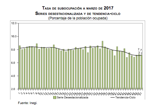 La información preliminar de la ENOE para el mes en cuestión señala que la población subocupada, medida como aquella que declaró tener necesidad y disponibilidad para trabajar más horas representó 7.2% de la población ocupada según series desestacionalizadas; dicha tasa fue menor a la de 7.3% de febrero pasado.
