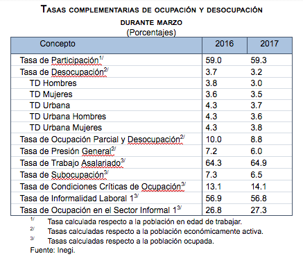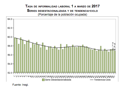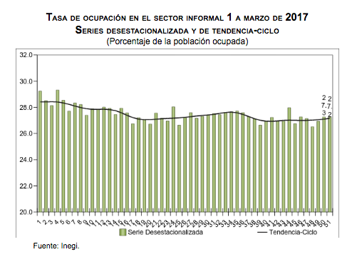 Mientras que la proporción de la población ocupada en unidades económicas no agropecuarias operadas sin registros contables y que funcionan a partir de los recursos del hogar o de la persona que encabeza la actividad sin que se constituya como empresa (Tasa de Ocupación en el Sector Informal), representó el 27.2% en el tercer mes de este año, cifra menor a la registrada en febrero que cerró en 27.3% y mayor en 0.6 puntos frente a marzo del 2016.