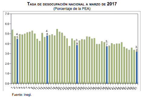 En el país, la tasa de desocupación (TD) fue de 3.2% de la PEA en marzo de 2017, proporción inferior a la registrada en el mismo mes de un año antes, cuando se ubicó en 3.7%. En el mes que se reporta, un 17.4% de los desocupados no contaba con estudios completos de secundaria, en tanto que los de mayor nivel de instrucción representaron al 82.6 por ciento. Las cifras para la situación de subocupación fueron de 37.4% y de 62.4%, respectivamente.