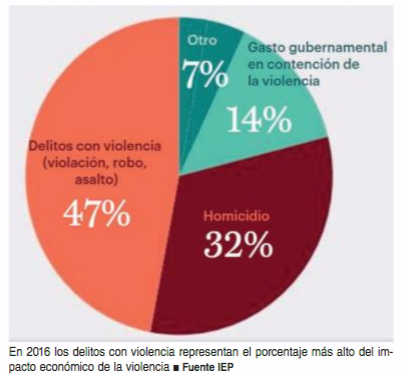 El impacto económico de la violencia el año pasado, fue de 3.07 billones de pesos, lo que implica un aumento de 79 millones de pesos en comparación con 2015. Esta suma equivale a 18 por ciento del Producto Interno Bruto (PIB). Aguascalientes gastó 25 mil pesos per cápita en el combate a la violencia; los estados menos pacíficos se enfrentan a pérdidas económicas mayores por habitante, lo cual resta dinero para el desarrollo económico y social.