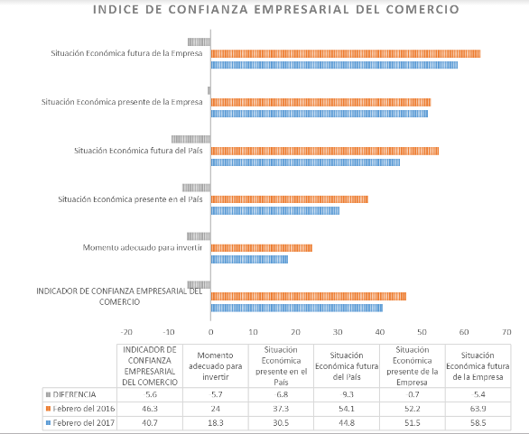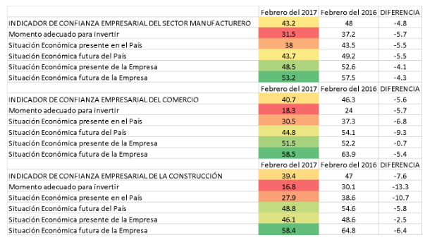 También podemos tener una lectura por comparación anual, el Indicador de Confianza Empresarial por sector de actividad mostró en su comparativo 2016 contra 2017 el siguiente comportamiento: el ICE de la Construcción descendió (-)7.6 puntos, el de las Manufacturas (-)4.8 puntos y el del Comercio (-)5.6 puntos, en su lectura dada a conocer en marzo del año en curso con relación a la del 2016.
