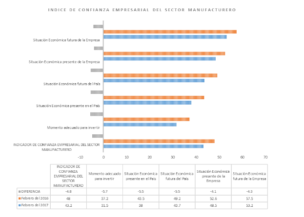 En su comparación mensual, el ICE Manufacturero se ubicó en 43.2 puntos durante febrero de 2017, cifra menor en (-)0.5 puntos respecto a la del mes inmediato anterior, según series desestacionalizadas. Con este dato el Indicador de Confianza Empresarial Manufacturero se mantiene por debajo del umbral de los 50 puntos por 24 meses consecutivos.