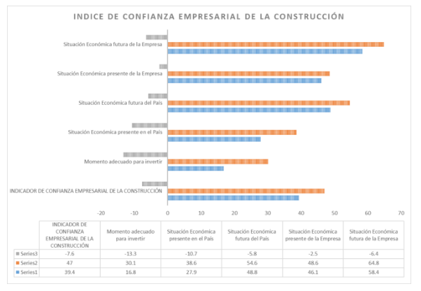 Desde el 2012 los tres sectores consultados, el manufacturero, el de la construcción y el del comercio se han comportado con índices de confianza muy semejantes, si acaso el del comercio durante los dos primeros trimestres del 2013 se desfasó hacia valores superiores o de mayor optimismo que el resto; se asumen los valores por encima de los 50 puntos como optimistas y los menores como pesimistas, por lo que básicamente se encuentran los sectores pesimistas; si acaso, optimistas de cara al futuro, pero sin conceder a la coyuntura actual mayores expectativas en términos de confianza empresarial.